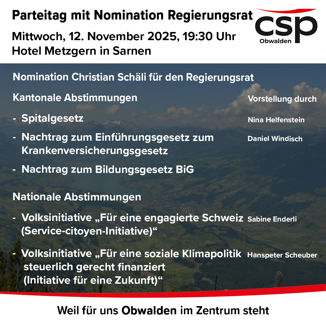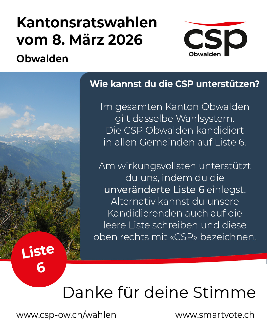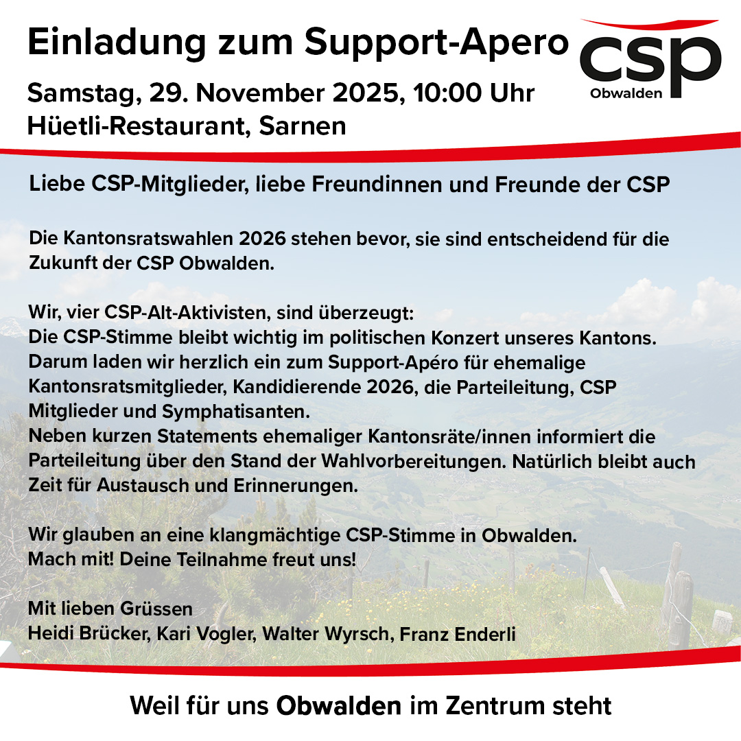 Die Parteileitung ist sehr erfreut, dass eine ehemalige Mandatsträgerin und drei ehemalige Mandatsträger, hinsichtlich der Kantonstratswahlen 2026, die CSP Obwalden mit einem Support Apero unterstützen möchten. Dieser findet am Samstag 29.November 2025 ab 10.00 Uhr im Restaurant Hüetli in Sarnen statt.